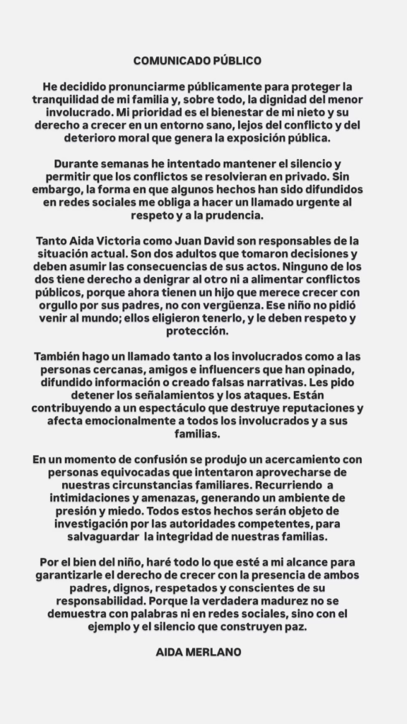 La excongresista también dirigió un mensaje directo a su hija y a Tejada, afirmando que ambos deben asumir su responsabilidad en medio del conflicto. “Tanto Aida Victoria como Juan David son responsables de la situación actual. Son dos adultos que tomaron decisiones y deben asumir las consecuencias de sus actos. Ninguno de los dos tiene derecho a denigrar al otro ni alimentar conflictos públicos, porque ahora tienen un hijo que merece crecer con sus padres, no con vergüenza. Ese niño no pidió venir al mundo; ellos eligieron tenerlo, y le deben respeto y protección”, afirmó.