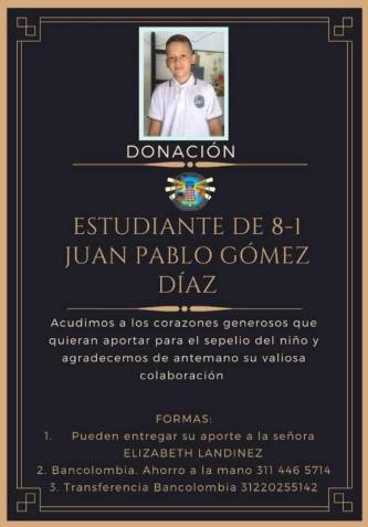 Ahora sus familiares, de escasos recursos, necesitan ayuda para cubrir los gastos funerarios. Para colaborar puede hacerlo a través de la cuenta de ahorro a la mano Bancolombia: 3114465714 o por transferencia a la cuenta 312 202 55 142.