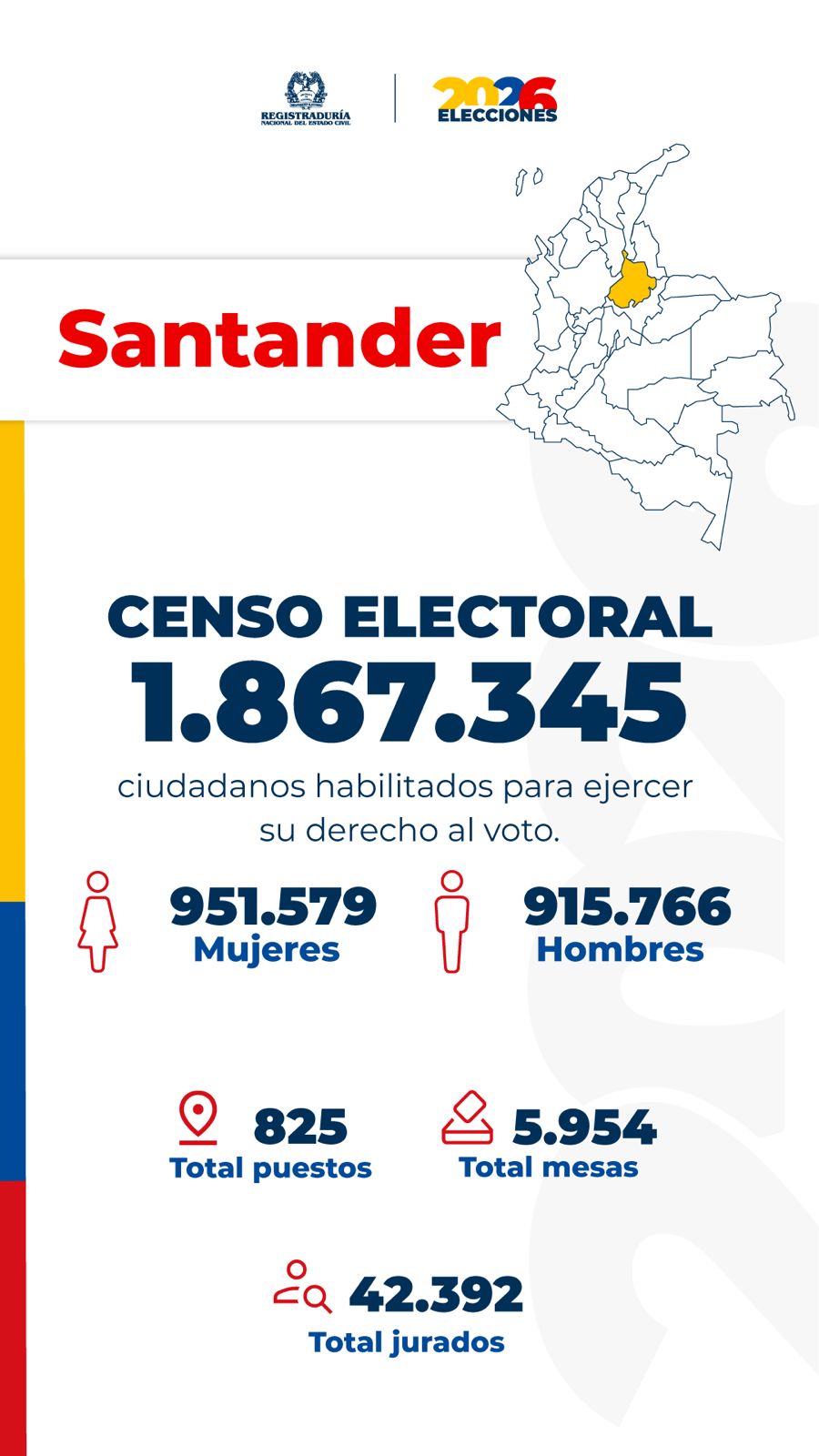 Santander se alista para elecciones de Congreso 2026 con más de 1,8 millones de votantes